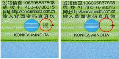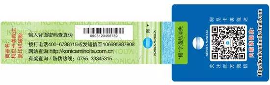 揭开柯尼卡美能达耗材瓶身防伪封口签,输入此防伪封口签(集成数码防伪标签)背面的20位防伪查询密码,发短信至106695887808※或拨打4006788315并按语音提示操作,就可以查询相关产品的真伪。