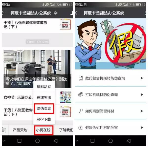 进入柯尼卡美能达办公系统微信公众号——点击底部菜单栏小柯在线——防伪查询——数码复合机耗材防伪查询/打印机耗材防伪查询——按提示操作即可