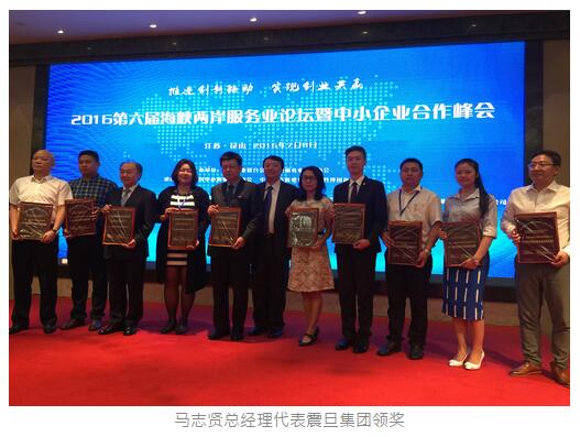 为进一步推动海峡两岸中小企业的合作,加强服务中小企业各类型机构的交流,由中国商业联合会、台湾服务业联盟协会共同主办,中国中小商业企业协会联合承办的第六届海峡两岸服务业论坛暨中小企业合作峰会,于7月6日至8日在江苏省昆山市皇冠国际会展酒店隆重举行。震旦集团荣获“海峡两岸卓越表现奖”,马志贤总经理代表震旦受邀出席领奖,同时在市场创新服务峰会上进行以品牌创新为主题的演讲,获得了在场嘉宾的阵阵掌声。