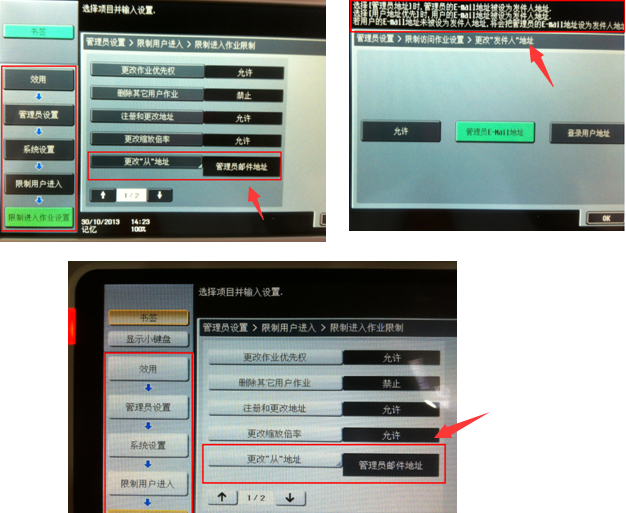3.检查复印机设置,在AD289“管理员设置”-“系统设置”-“限制用户进入”-“限制进入作业设置”-“默认‘从’地址”的设置中,将装机默认的“登陆用户地址”改为“管理员E-MAIL地址”。